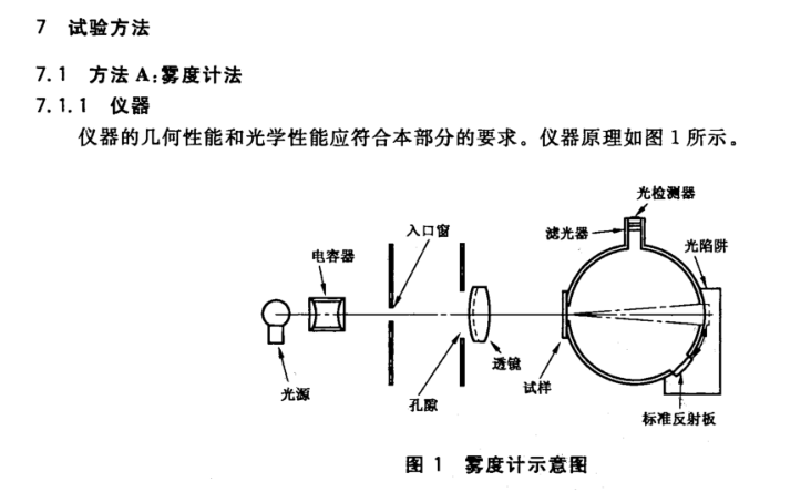 方法A中详细规定了雾度计的几何性能和光学性能,详情可查看7.11