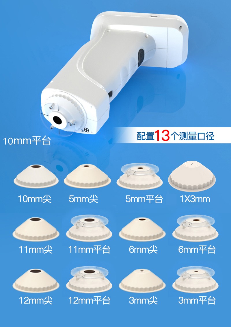 配置了3mm平台+3mm尖嘴+5mm平台+5mm尖嘴+6mm平台+6mm尖嘴+10mm平台+10mm尖嘴+11mm平台+11mm尖嘴+12mm平台+12mm尖嘴+1*3mm共十三个测量口径,测量范围更广泛,用户可根据样品实际测量需求自由切换测量口径。